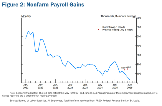 劳动力市场就是一个很好的例子。本月早些时候发布的7月份就业报告显示,过去三个月平均每月新增就业岗位放缓至仅3.5万个,低于2024年期间的每月16.8万个(图2)。这一放缓幅度远大于仅一个月前的评估,因为5月和6月的早期数据被大幅下修。但这似乎并未导致劳动力市场出现我们希望避免的大量松弛。失业率虽在7月份略有上升,但仍处于4.2%的历史低位,并在过去一年中基本保持稳定。其他劳动力市场状况指标也变化不大或仅温和走软,包括离职、裁员、职位空缺与失业人数之比以及名义工资增长。劳动力供给与需求同步走软,大幅降低了维持失业率不变所需的“盈亏平衡”就业创造率。事实上,随着移民数量的急剧下降,今年的劳动力增长已显著放缓,劳动力参与率在近几个月也有所下降。