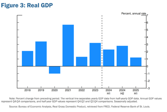 At the same time, GDP growth has slowed notably in the first half of this year to a pace of 1.2 percent, roughly half the 2.5 percent pace in 2024 (figure 3). The decline in growth has largely reflected a slowdown in consumer spending. As with the labor market, some of the slowing in GDP likely reflects slower growth of supply or potential output.