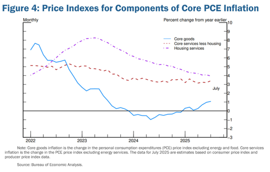 转向通胀方面,更高的关税已开始推高某些类别商品的价格。基于最新可用数据的估计显示,在截至7月的12个月里,总体PCE价格上涨了2.6%。剔除波动的食品和能源类别后,核心PCE价格上涨了2.9%,高于一年前的水平。在核心通胀内部,过去12个月商品价格上涨了1.1%,这与2024年期间出现的温和下降相比是一个显著的转变。相比之下,住房服务通胀仍处于下降趋势,而非住房服务通胀的运行水平仍略高于历史上与2%通胀相符的水平(图4)。